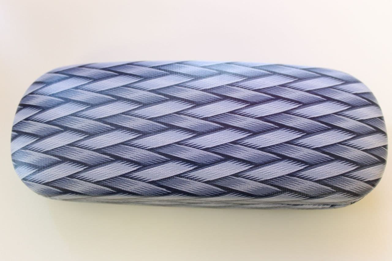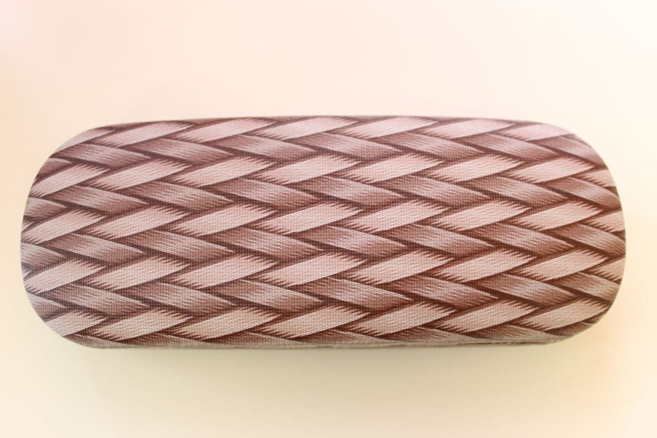 This stylish eyeglass case features a unique woven or braided texture design, creating a sophisticated visual interest. The case is also available in a complementary blue color and in subtle earth tones. This protective hard-shell case is perfect for securing your eyewear while adding a touch of contemporary design to your accessories.