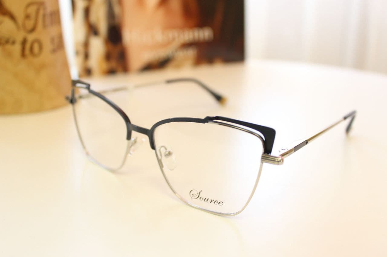 Make a striking statement with these unique Source eyeglasses. Featuring a sophisticated semi-rimless design, the frames combine a sleek black top rim with a contrasting silver-tone lower half, creating a modern and architectural aesthetic. The distinctive cut-out detail on the upper corners adds an edgy, avant-garde touch, perfect for those who appreciate contemporary style and refined individuality.